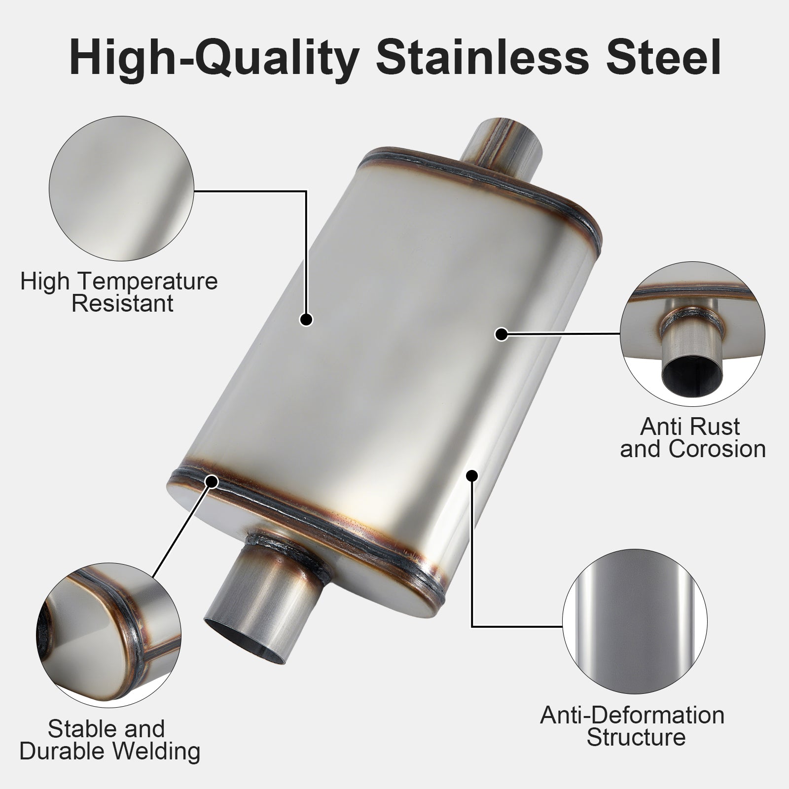 • DURABLE STAINLESS STEEL: Universal exhaust muffler constructed from high-quality 409 stainless steel, it offers strong corrosion resistance and maintains structural strength in high-temperature environments, significantly extending service life and reducing moisture accumulation.