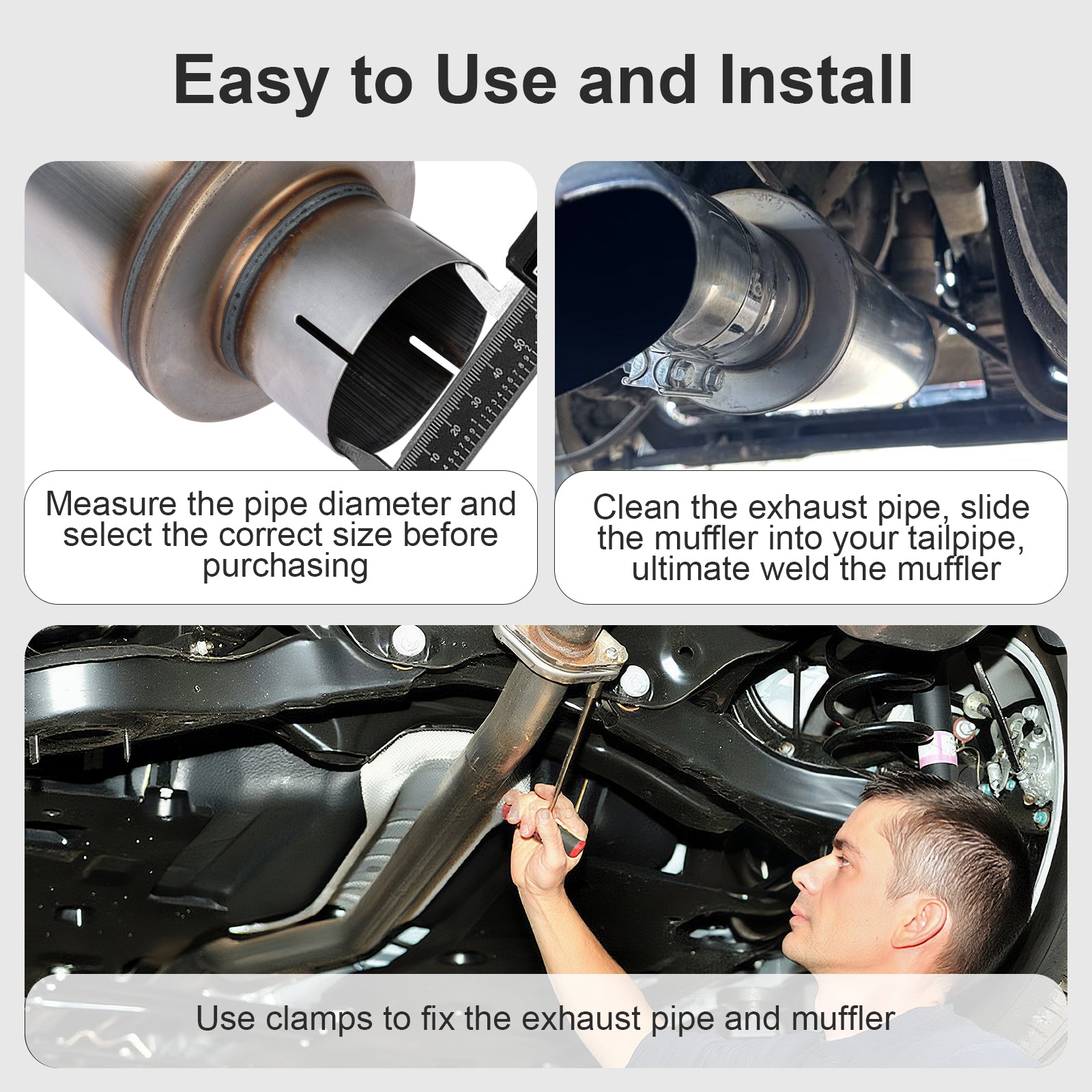 • DURABLE STAINLESS STEEL: Universal exhaust muffler constructed from high-quality 409 stainless steel, it offers strong corrosion resistance and maintains structural strength in high-temperature environments, significantly extending service life and reducing moisture accumulation.