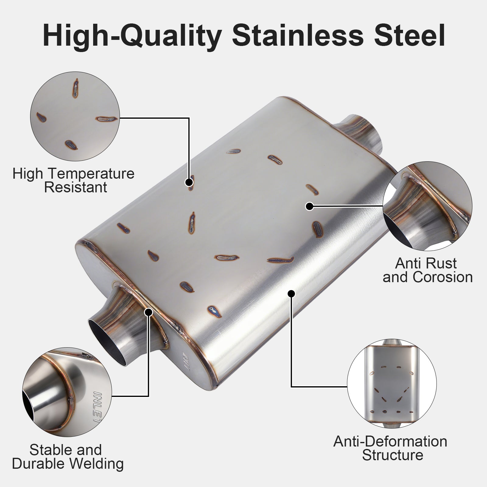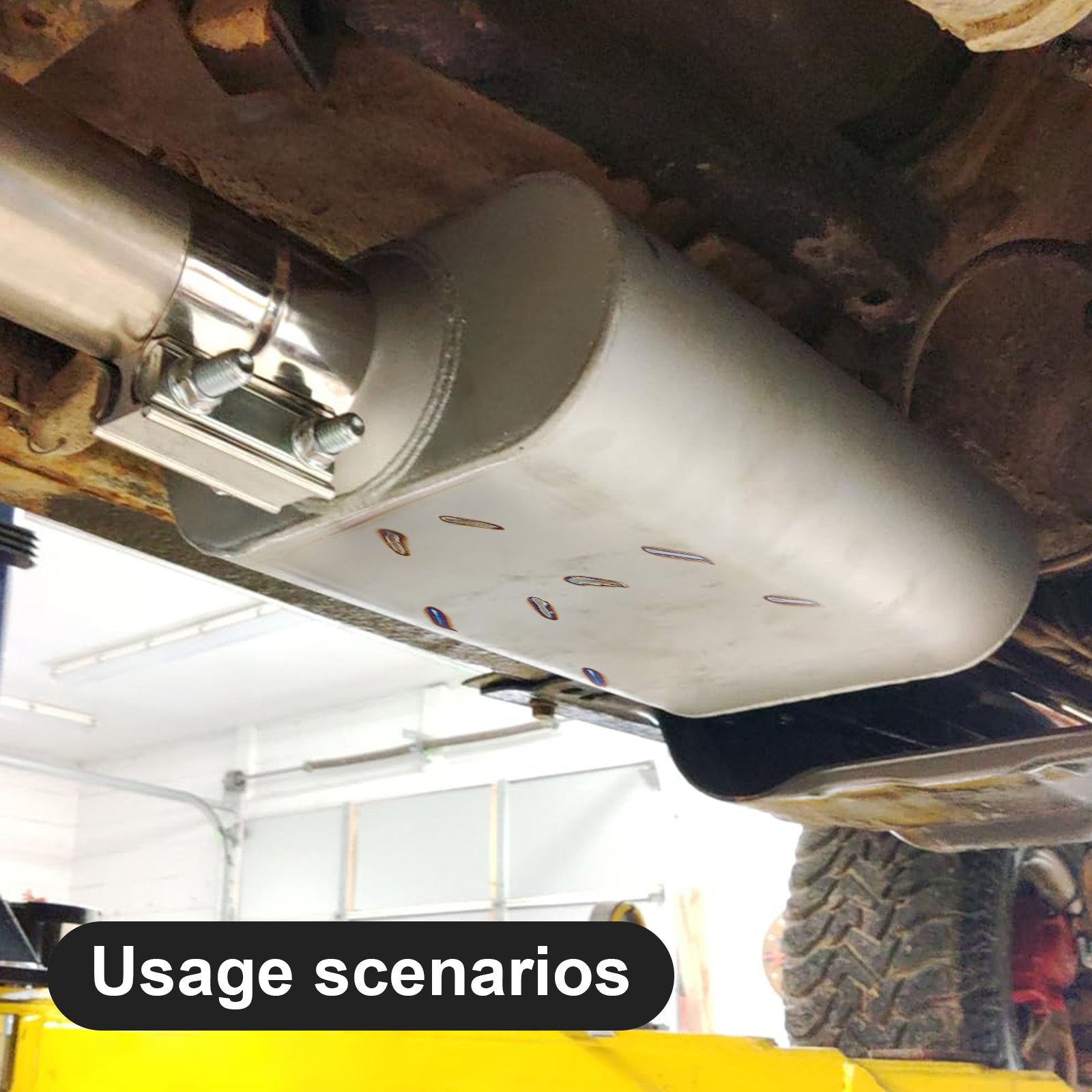• DURABLE STAINLESS STEEL: Universal exhaust muffler constructed from high-quality 409 stainless steel, it offers strong corrosion resistance and maintains structural strength in high-temperature environments, significantly extending service life and reducing moisture accumulation.
